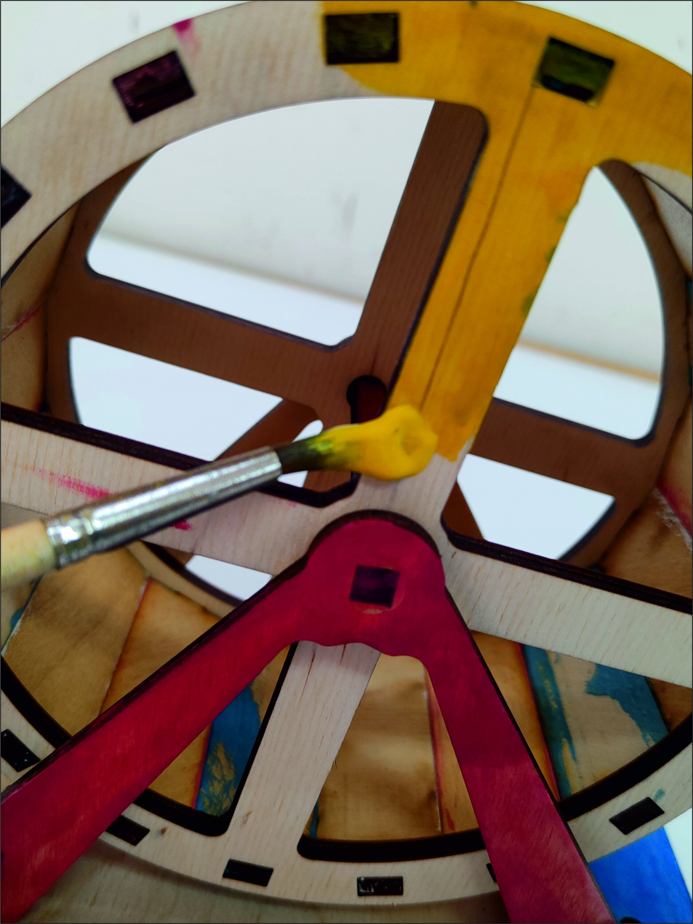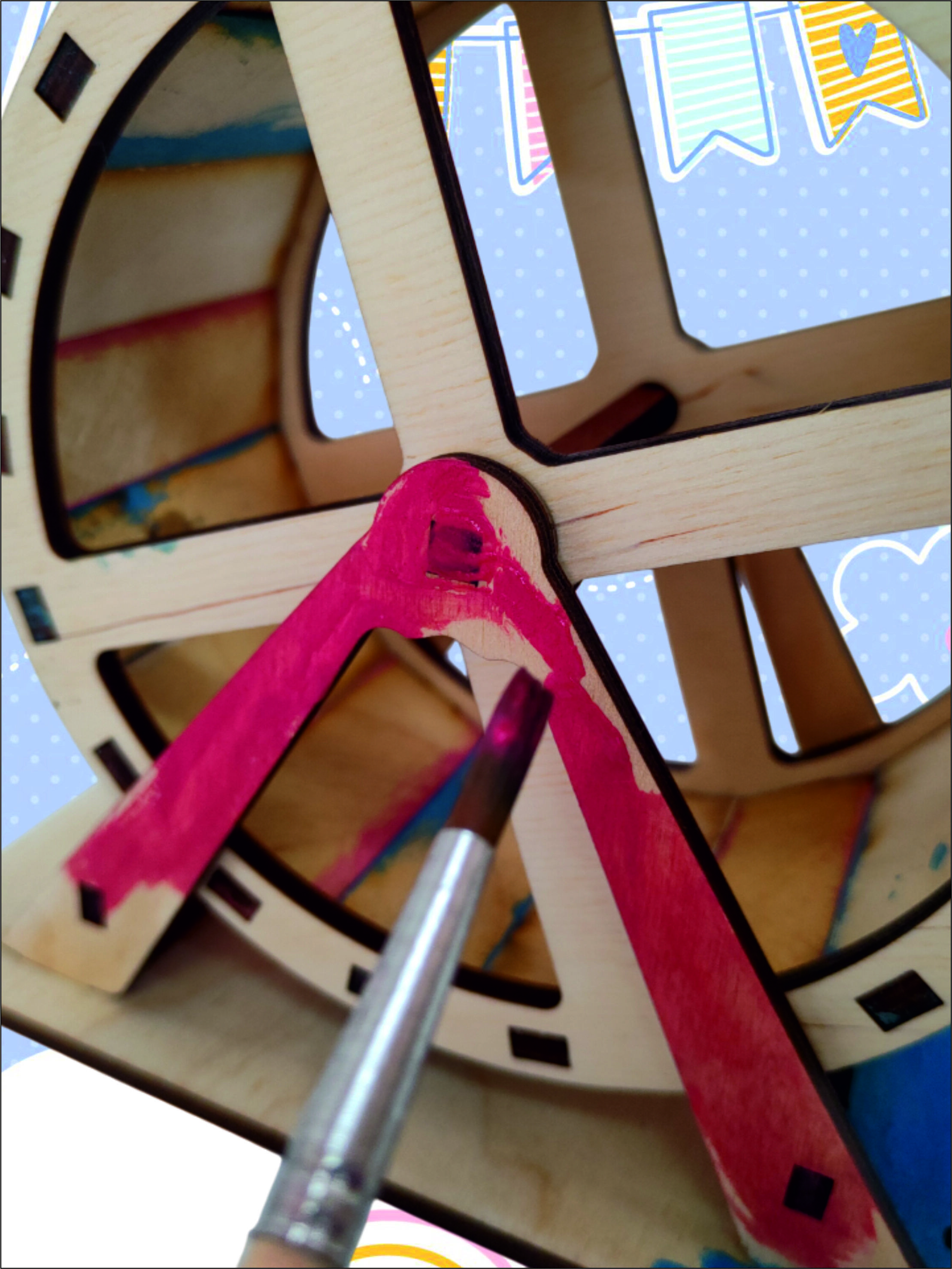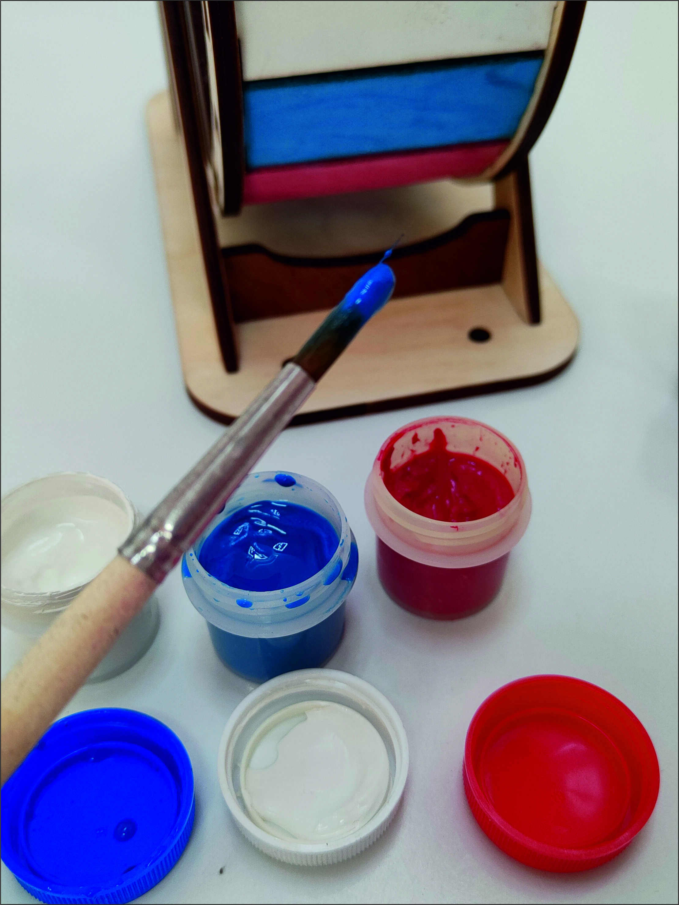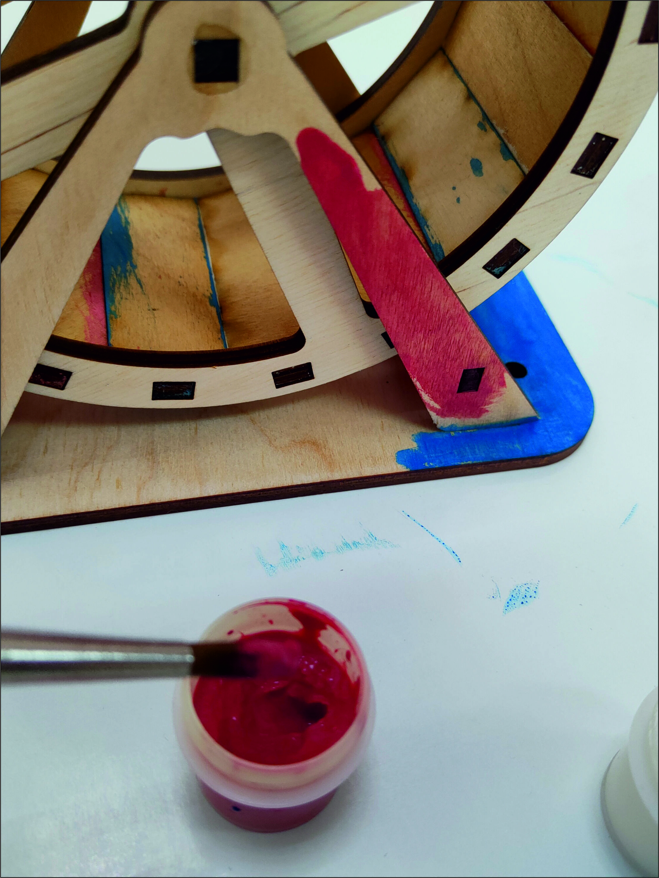 В набор входит плотная гуашь девяти ярких цветов и удобная кисточка. Краска отлично ложится на шлифованную поверхность дерева, не скатывается и создает сочное, непрозрачное покрытие. Вы можете раскрасить колесо в любые цвета, создать уникальный узор или нарисовать целую картину.