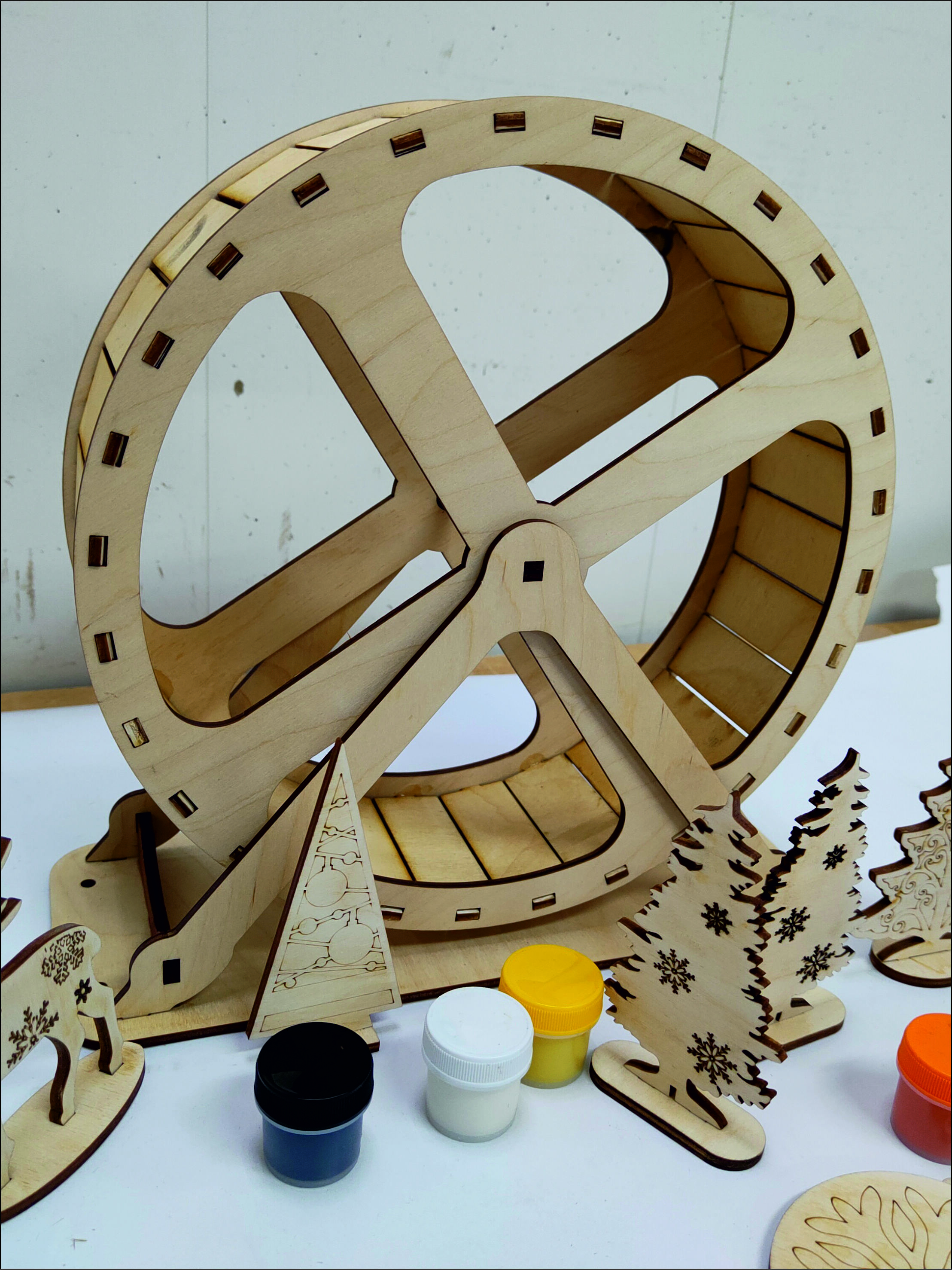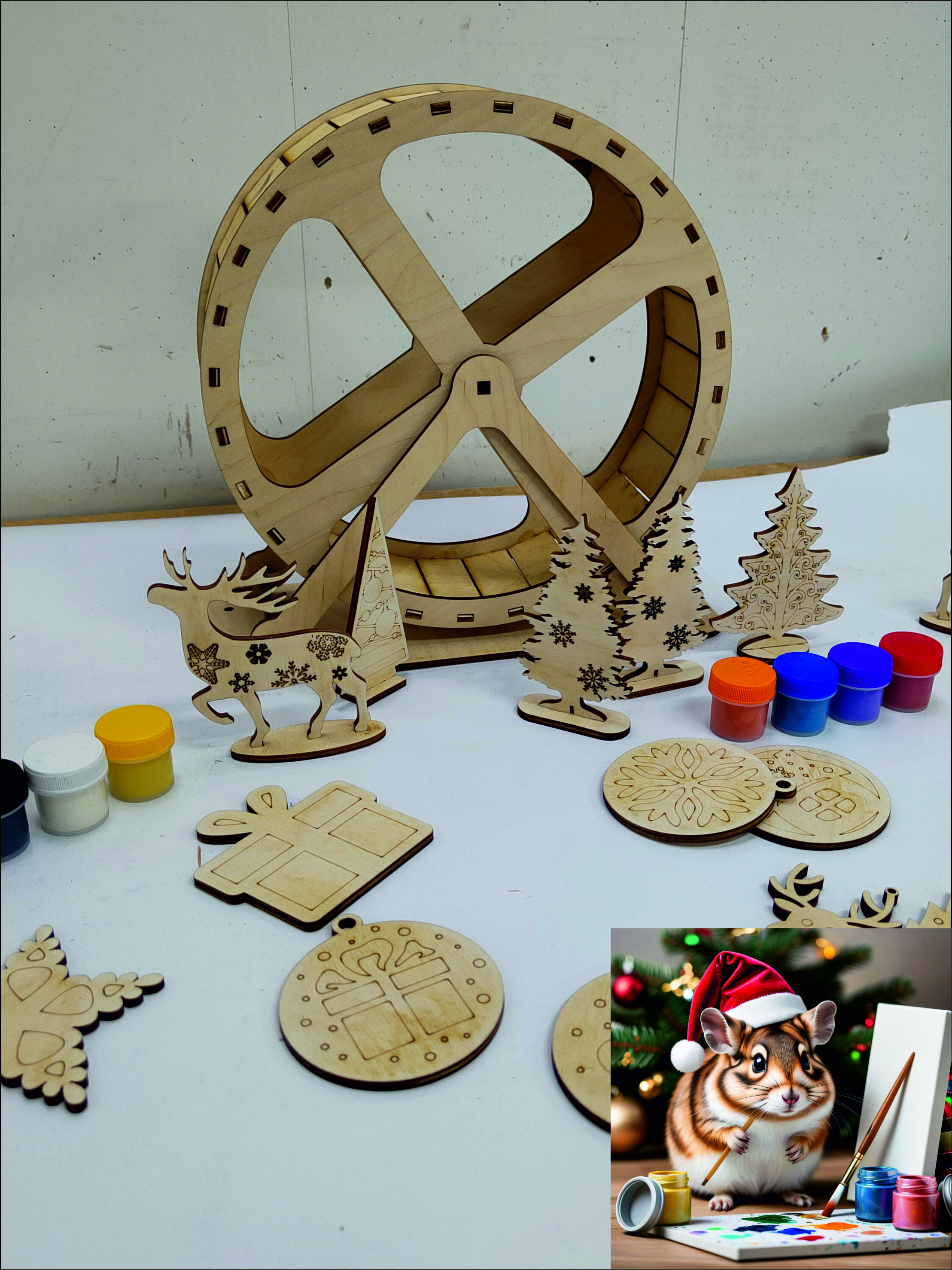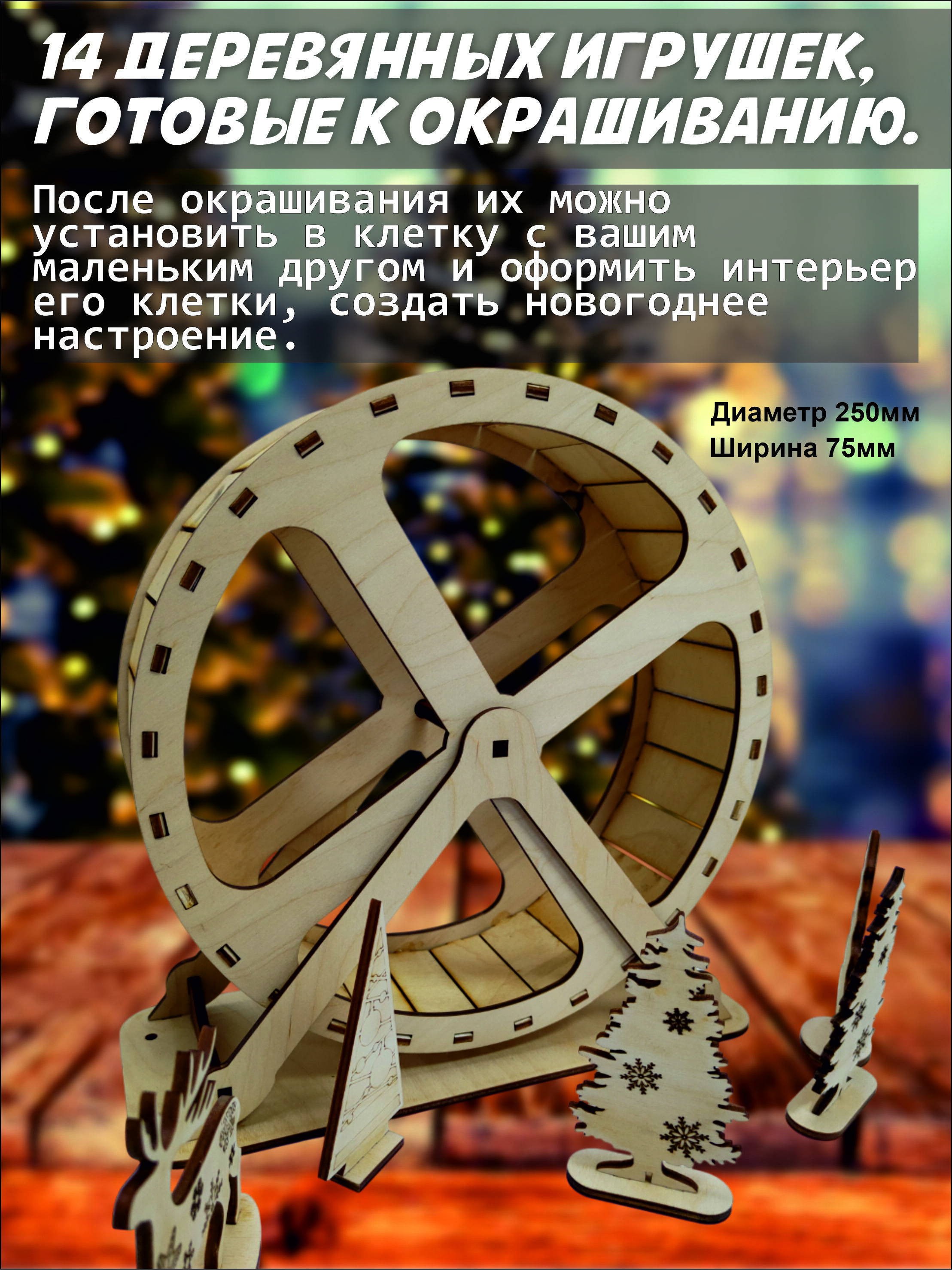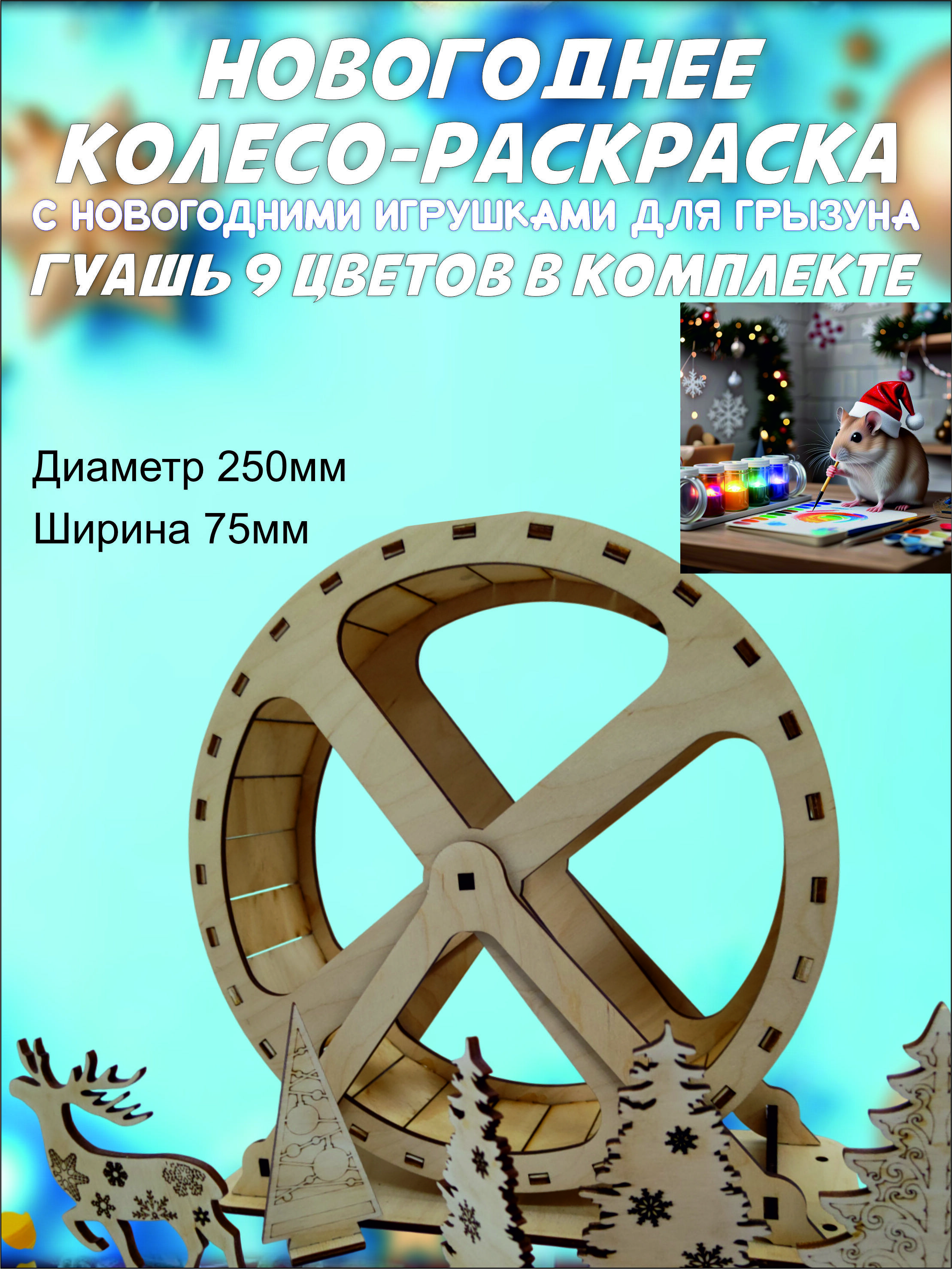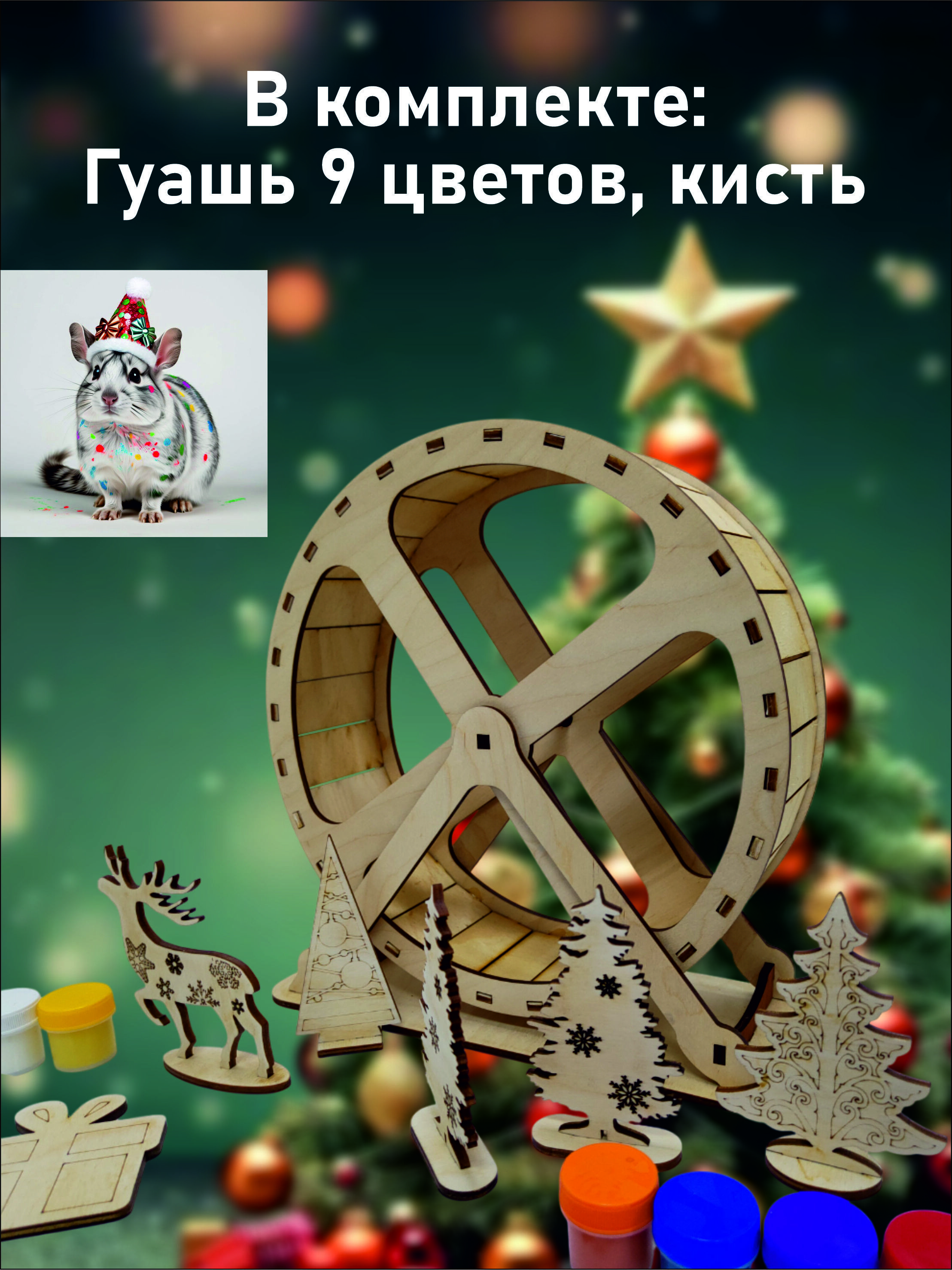 Этот уникальный набор сочетает в себе полноразмерный тренажер для физической активности вашего грызуна и творческую мастерскую для создания праздничной атмосферы.